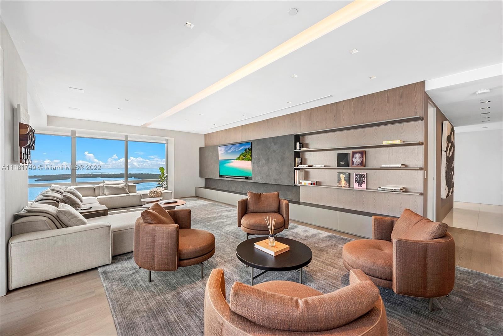 On the 52nd floor of the Four Seasons, the definition of luxury modern living soars above the Miami skyline. This residence features 5 bedrooms, 6.5 baths plus a studio guest room, and floor-to-ceiling glass windows that overlook the Biscayne Bay. An expansive open kitchen and dining leads into a luxurious family room plus an additional casual family media room with a functional bar. The designer kitchen is equipped with stainless steel appliances and sleek-finished countertops. The Four Seasons concierge and hotel services are 24/7 and 5-star amenities such as a private pool, hotel pool/bar access, and an Equinox gym membership are available for residents.