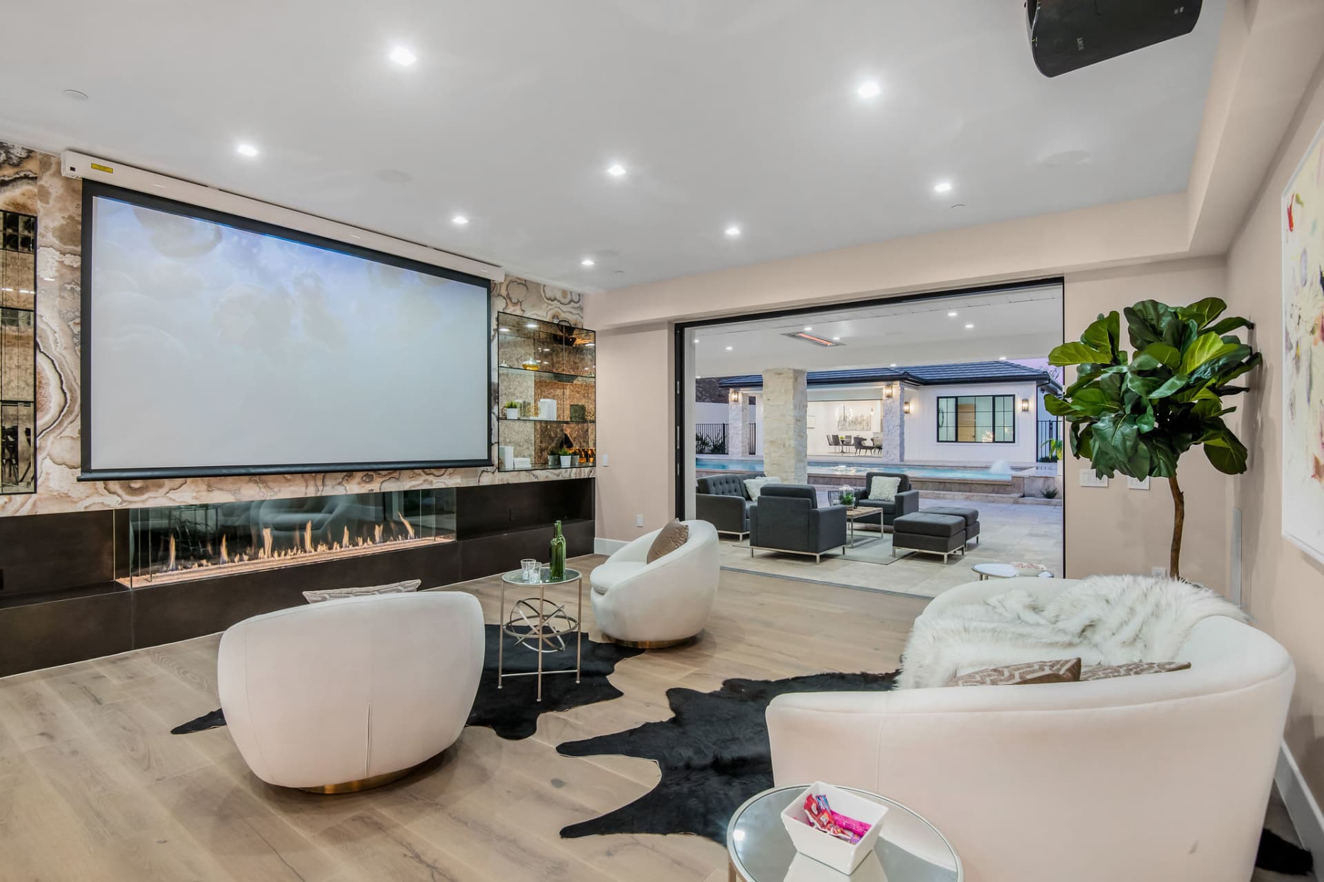 This beautiful newly constructed estate is situated on over 1 acre of land, elevated with views of the beautiful hills and open countryside. Watch the sunset in peaceful solitude from your private backyard, outdoor heated living space, pool house, 2 stall barn with bathroom, and a large grassy play area. The backyard includes a built-in barbecue, outdoor fireplace, fire pit, multiple pool decks, and more.