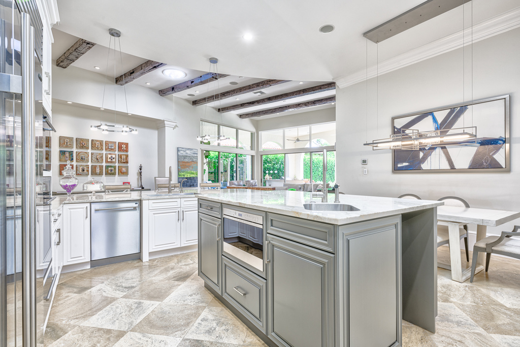 IMMEDIATE GOLF MEMBERSHIP AVAILABLE! Nestled in the serene Noble Heron neighborhood of the coveted Grey Oaks Country Club, this exquisite former Alamanda model home features 3 bedrooms plus a study, 3.5 bathrooms, and a location at the end of a quiet cul-de-sac, offering unparalleled privacy and elegance. The home welcomes you with a private paver courtyard featuring a rotunda, a fountain and a mahogany entry door. The outdoor living space is an oasis, boasting a covered loggia with a fully equipped summer kitchen, a custom-designed pool and spa with a cascading waterfall, and a cozy outdoor gathering area complete with a gas fireplace. Inside, the residence unfolds into an open and spacious living area with soaring ceilings ranging from 11′-14′, Saturnia stone flooring, and antique wood beams in the great room. The formal dining room is complemented by a built-in china hutch and butler’s pantry, while the state-of-the-art gourmet kitchen caters to culinary excellence. The luxurious master suite features a private vestibule entry, a convenient morning bar, and a sitting area, creating a private retreat within this magnificent home. The property has seen a series of enhancements starting in 2010, with significant remodeling undertaken in 2016-2017, including: – Enhanced landscaping and extended brickwork.
