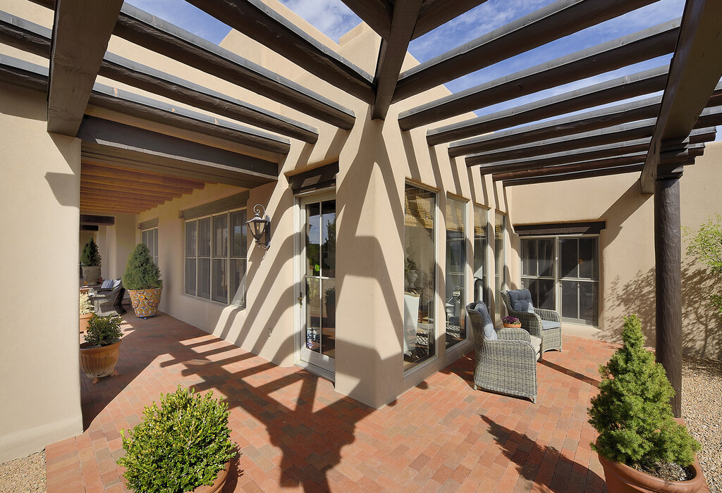 Exquisite 4 bedroom 4 bath home with exceptional Sangre de Cristo and Jemez Mountain views in Estates I in Las Campanas. Timeless, classic Santa Fe architectural design creates a warm, inviting ambiance with plaster finish walls, hand-carved doors, custom cabinetry, slate and wide plank floors, coved ceilings, and vigas and beams.
