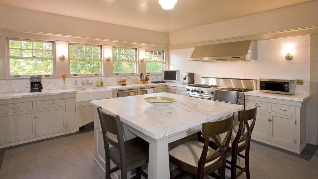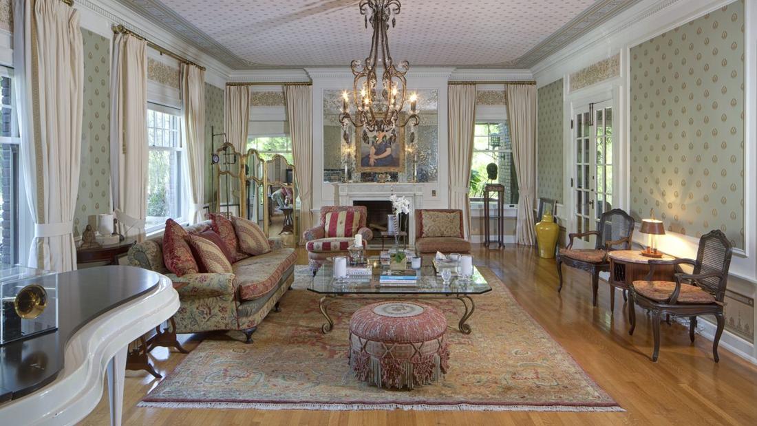 It has since been restored and features handcrafted mahogany doors, painted and beamed ceilings, and six wood-burning fireplaces. A wood-paneled foyer leads to a formal living room, a dining room, a den, a family room, and a wet bar. The kitchen is centered around a wide, marble island. There is a game room on the third floor.