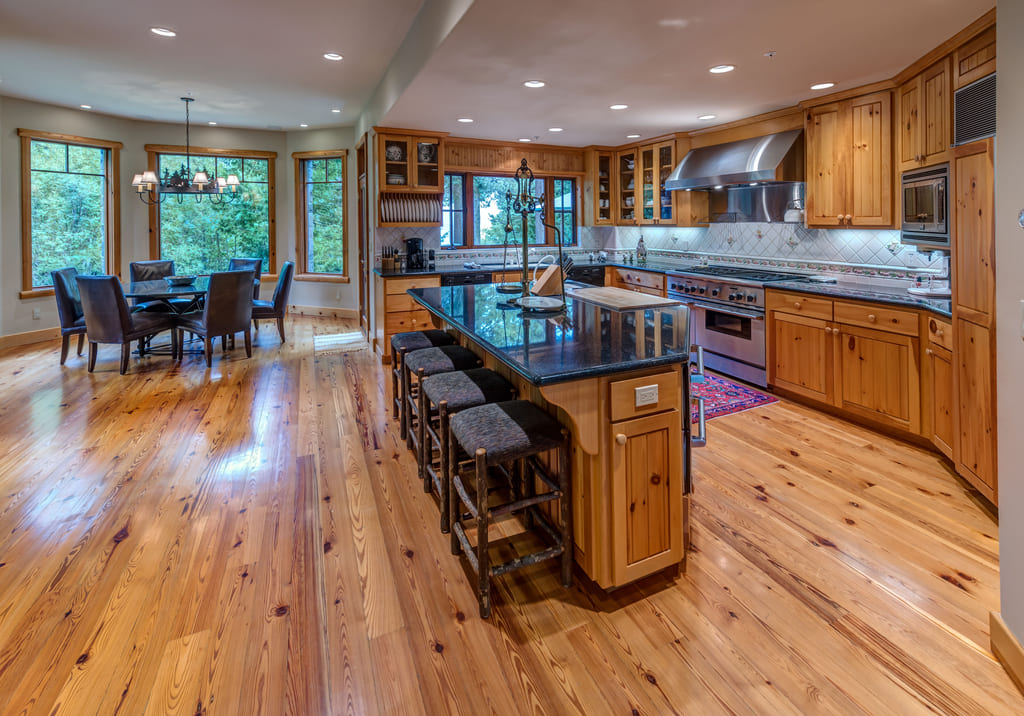 The historic character of the estate is exemplified by the quaint, four-bedroom cabin located in the front of the property. The structure is believed to have been built in the 1940s, before being reclaimed, restored, and relocated to its present location. Offering the ultimate seclusion for guests or visiting family, the 1,455-sq. ft. cabin is old Tahoe at its charming best, featuring four bedrooms, two bathrooms, pine-paneled walls and ceilings, distressed virgin grain fir floors, and a deck overlooking the adjacent lawn, gardens, and volleyball court.