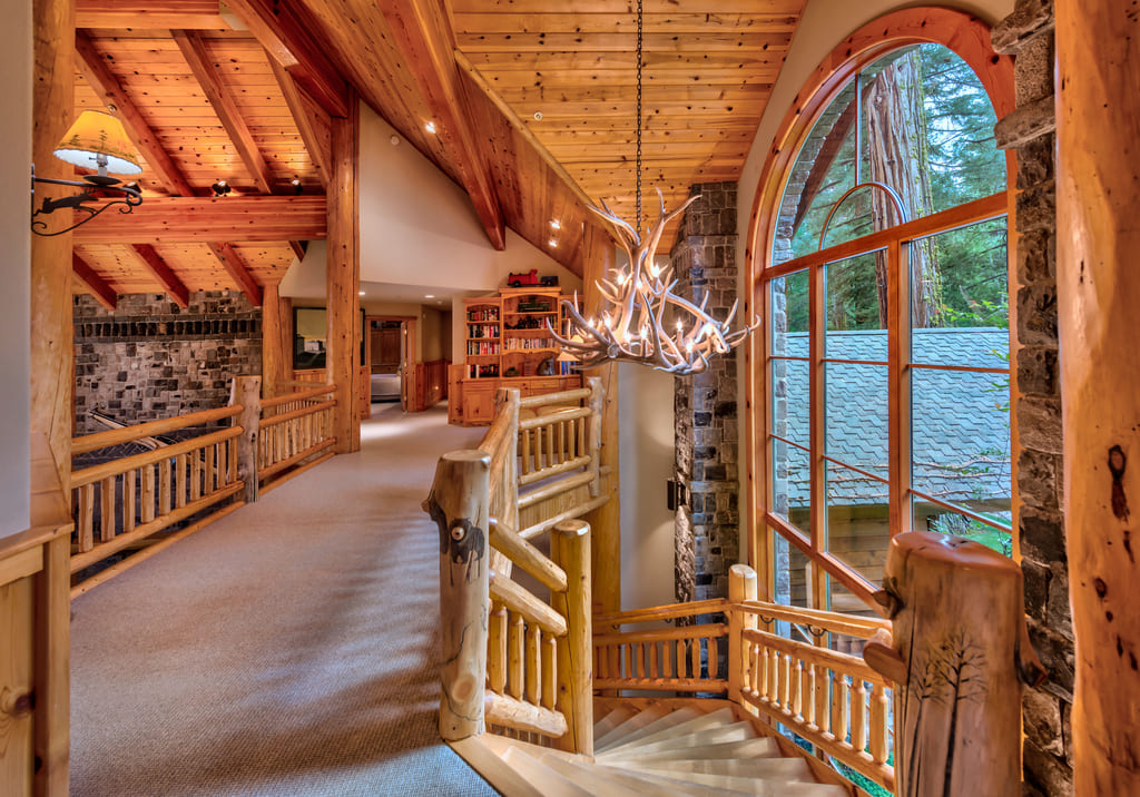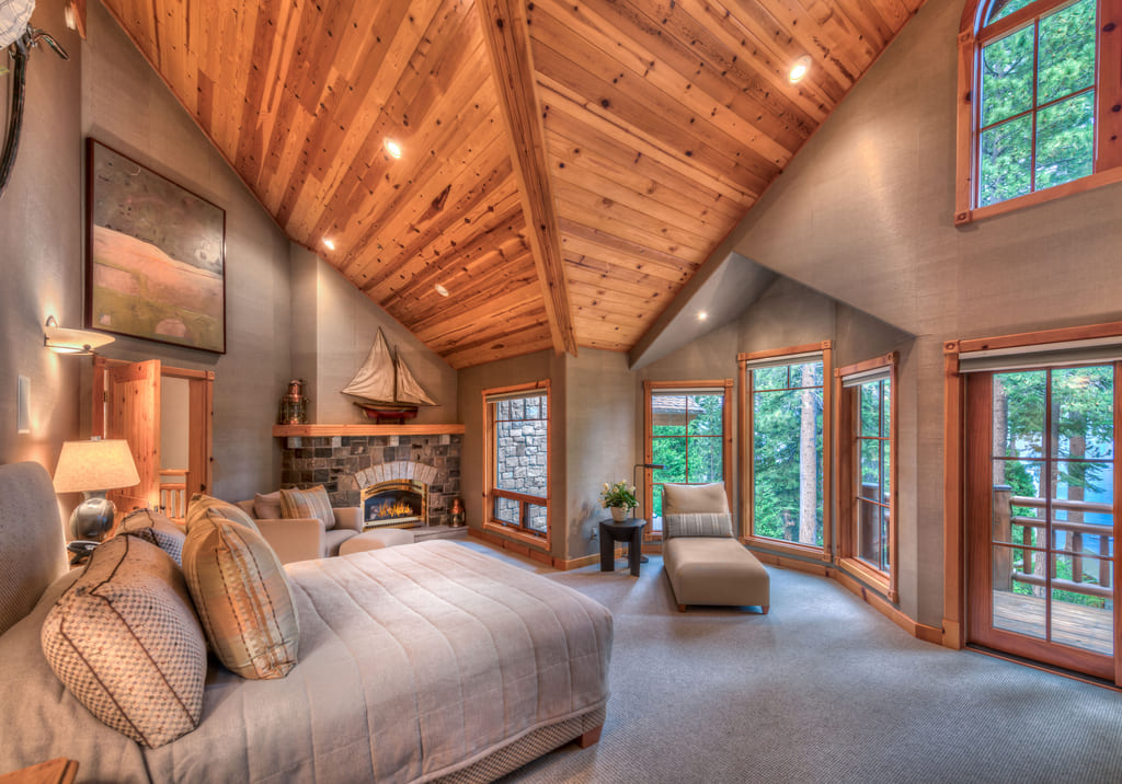 The timber-clad interior of the main house is a celebration of Tahoe vernacular—soaring cathedral ceilings, enormous picture windows, flagstone floors, and finely crafted timber details. Designed to entertain large groups of family and friends, the estate is an entertainer’s dream with an expansive great room, dining room, a fully equipped gym, a game room, and an indoor pool. A two-wing layout allows maximum privacy connected by a log stairway and breezeway. The dramatic primary suite features vaulted ceilings and a fireplace, and there are four additional suites for guests located in one wing. When a large family gathers, a youth bunk room in the adjacent wing can accommodate up to 10 children. On the ground level, all of the rooms on the lake view side of the property open to a large deck that overlooks the treetops and provides glimpses of the lake. Below the deck is a flagstone stairway and garden path that winds through the garden down to the boat house/bungalow, the private pier, and the lakeshore.
