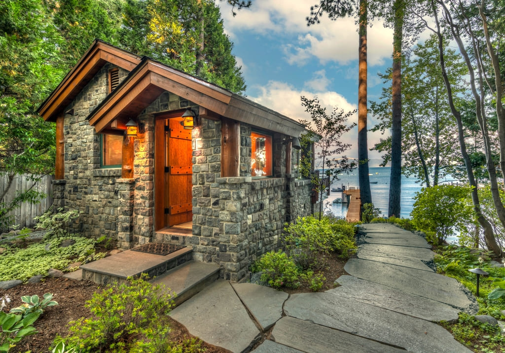 This main residence has 8,168 sq. ft. of living space and features six bedrooms. Built in 1998, the home’s curved proportions evoke a historical grandness that comes from the reclaimed cobblestones used to craft the grand fireplace and select exterior walls. These richly patinated stones—from which Greystone Tahoe takes its name— were initially transported from Europe in the ballast of ships and later used to pave the streets of San Francisco. At Greystone Tahoe, they give a timeless nod to the bygone era of old Lake Tahoe, and its roots as an affluent escape for San Francisco Bay Area elites.