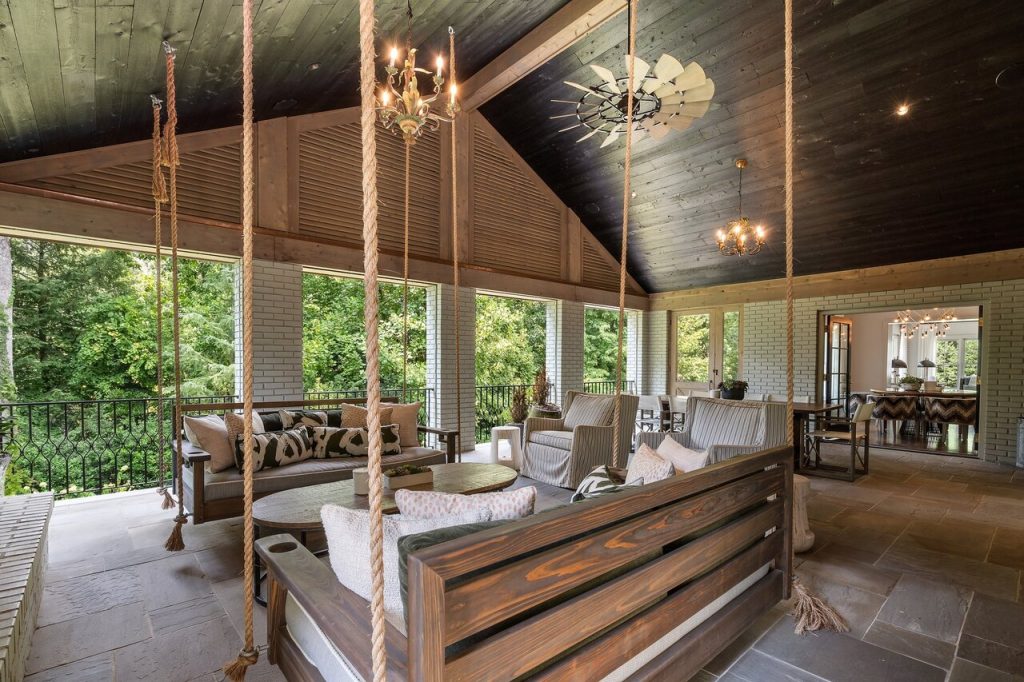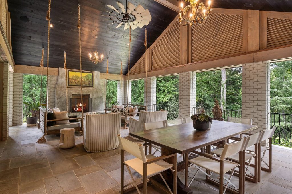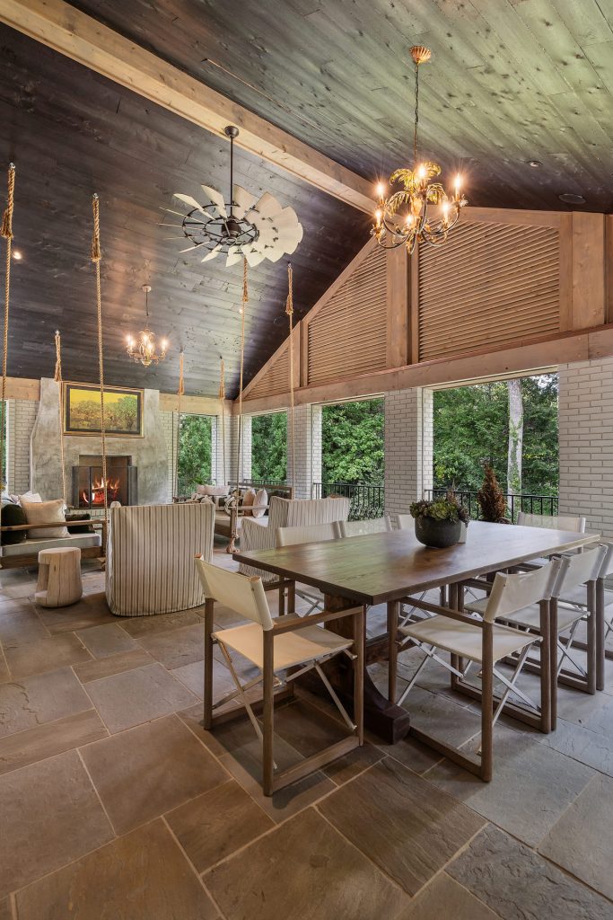 The main level features seamless indoor and outdoor entertaining spaces, starting with a newly built screened-in porch with a fireplace, grill, and dining area. Retractable screens allow for effortless outdoor living, with hanging swings and a hidden TV by the fireplace for watching sports. The space is anchored by bluestone flooring, Japanese ‘Shou Sugi Ban’ wood, and angled ceilings, creating a sophisticated atmosphere. Conveniently located next to the gourmet kitchen, this space opens to the pool area.