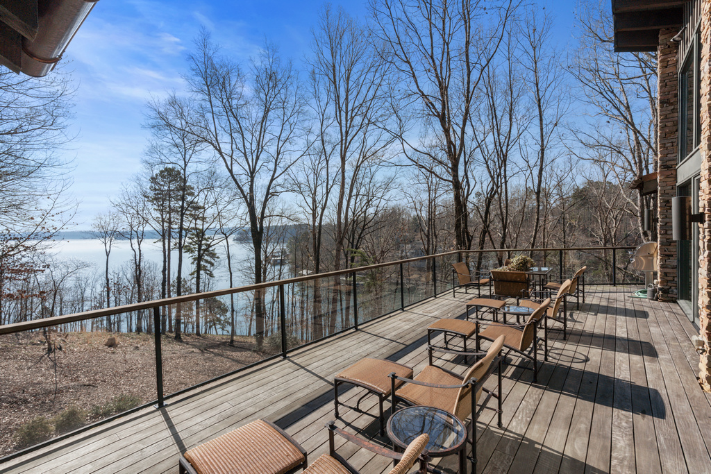 An exceptionally redesigned Mid Century Modern residence on a rare peninsula lot overlooking Lake Lanier. AIA Jack Davis transformed this residence with incredible finishes and an enviable copper roof. This location is at the south end of the lake and is considered the most desirable location and is very near Alpharetta and John’s Creek and 45 minutes to Buckhead. Floor to ceiling glass windows capture long range views of the lake and property. Gorgeous, wide plank Carlyle wood floors on main and stone slab flooring downstairs. Pecky cypress paneling, custom lighting and stone countertops throughout. Five large bedrooms on two levels and all but one has incredible views. Four wood burning fireplaces. Double slip, deep water dock in the cove with expansive 41 foot deck that is perfect for entertaining. Paved path to dock. Screened porch with views. Large slab stone floors downstairs that walk out to the infinity edge heated pool. Imagine long range lake views from most every room, especially in the main living room and kitchen. This peninsula property is surrounded by 30 acres of protected Core property and very private at the end of the cul de sac. Main garage has vaulted beamed ceilings for future expansion and lower garage is perfect for the golf cart and boating supplies. Exceptional living with views from every window. Why live in the city when you can have this? Just 4 exits north of Alpharetta and the Avalon shopping district!