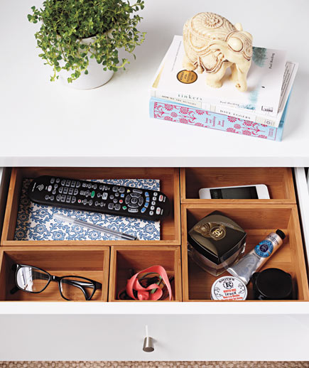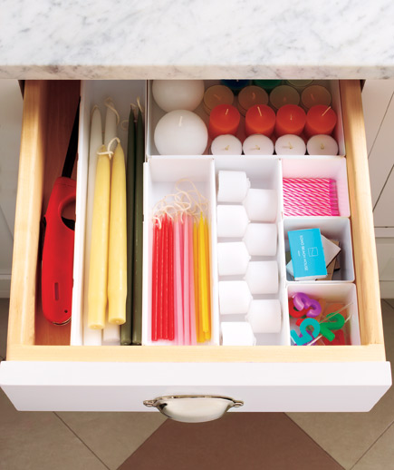 Benita Larson shares a similar mindset—she likes organizing drawers in compartments, but also recommends organizing them by content as well (e.g. an “all candles” drawer, an “all batteries” drawer, etc) so you can find more obscure items when you need them.