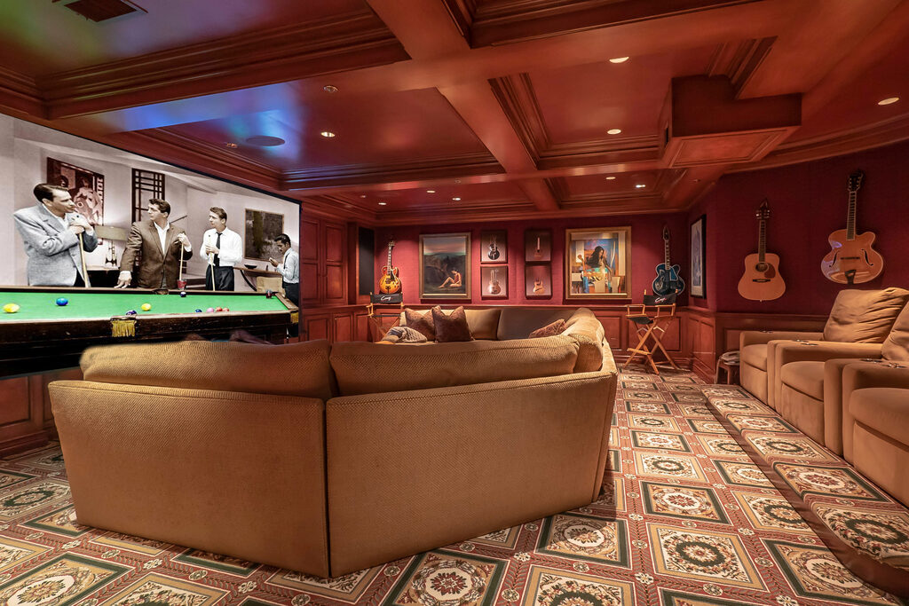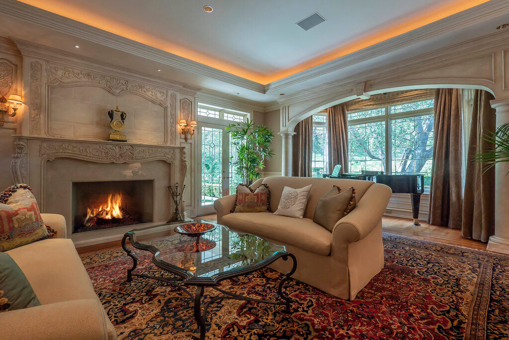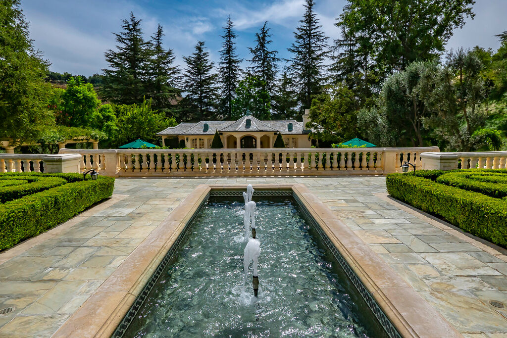 Welcome to this stunning estate in the guard-gated Country Club Estates, set behind extraordinary private gates, no expense has been spared on this Ron Firestone designed Chateau San Le Sou. Old-world craftsmanship and materials found throughout bring a sense of being transported to a bygone era of affluence and romance. The grand rotunda foyer leads to the formal living room with a fireplace and a huge family room with a fireplace and wet bar. The formal dining room with leaded glass windows overlooks the massive fountain in the courtyard. A gourmet kitchen featuring two center islands with a bar counter and wine refrigerator boasts professional appliances and a butler’s pantry. Upstairs the private master suite offers a sitting room, fireplace, and two completely separate bathrooms and dressing suites. French doors from the master suite will lead you to a wrap-around balcony with views of the resort-style pool, spa, and guesthouse. Plus 5 additional bedroom suites with one including a Parlor. Upstairs is also an In-laws suite or it could be used as an office area (approx. 1000 sq ft). Downstairs includes an office, movie theater & wine cellar. For your convenience an elevator for you. The two-bedroom, two-bath guesthouse has complete privacy. All this and the verdant grounds offer a sense of timeless luxury
