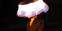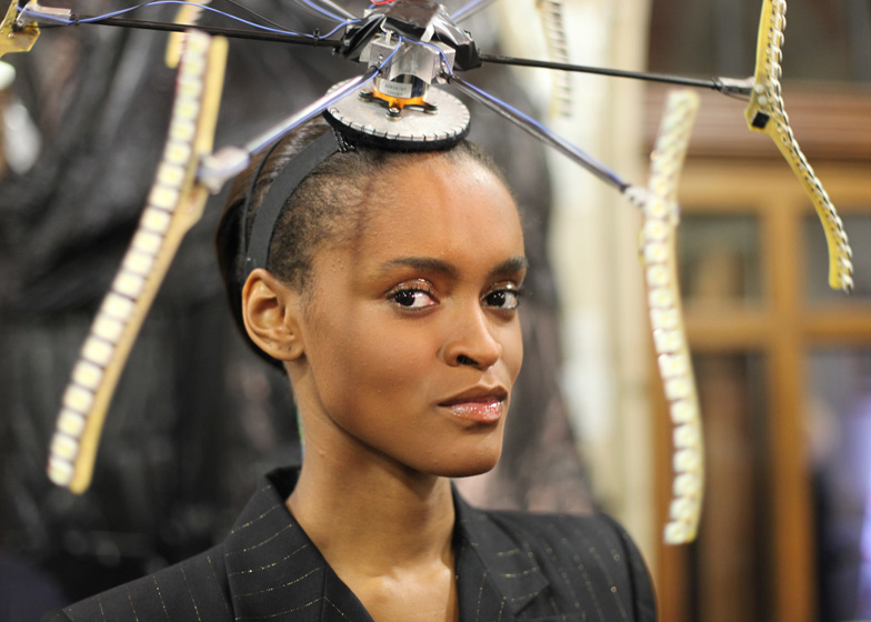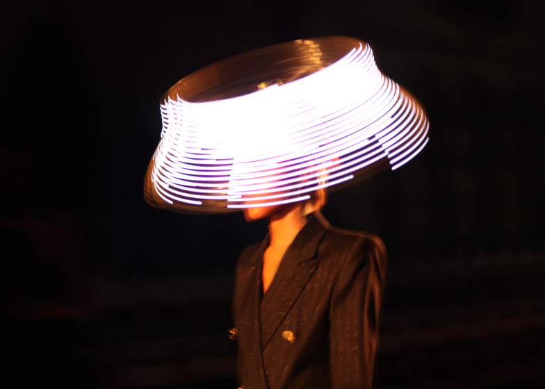 At luxury milliner Philip Treacy’s Spring/Summer 2013 runway presentation at London Fashion Week, Designer Moritz Waldemeyer has collaborated with luxury milliner Philip Treacy to create a unique hat which incorporates whirring light-emitting diodes (commonly known as LED lights). The resulting creation gives the illusion of an otherworldly, glowing hat.