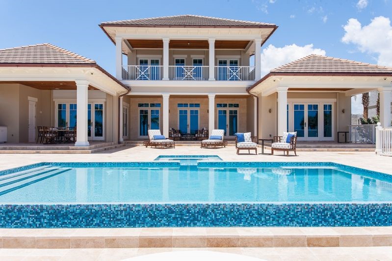The interior space includes a chef’s kitchen, 5 bedroom suites, 6 bathrooms, 2 half bathrooms (1 powder and 1 pool bath), study, great room, family room, second story loft, ocean room, butler’s pantry, grand foyer, and laundry. The meticulous design creates a seamless flow from the indoor to outdoor space.