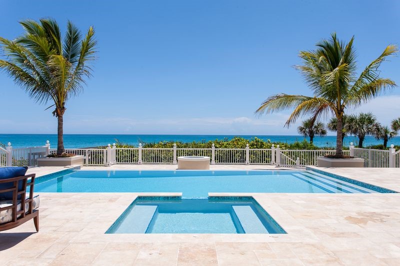 The living room features expansive sliders that open to the grand ocean limestone terrace creating a magnificent oasis with soaring vaulted ceilings, a heated pool and spa with infinity edge, a fire feature, and sweeping ocean vistas. This property is nearly an acre of Atlantic Oceanfront land epitomizing Florida Coastal Living.