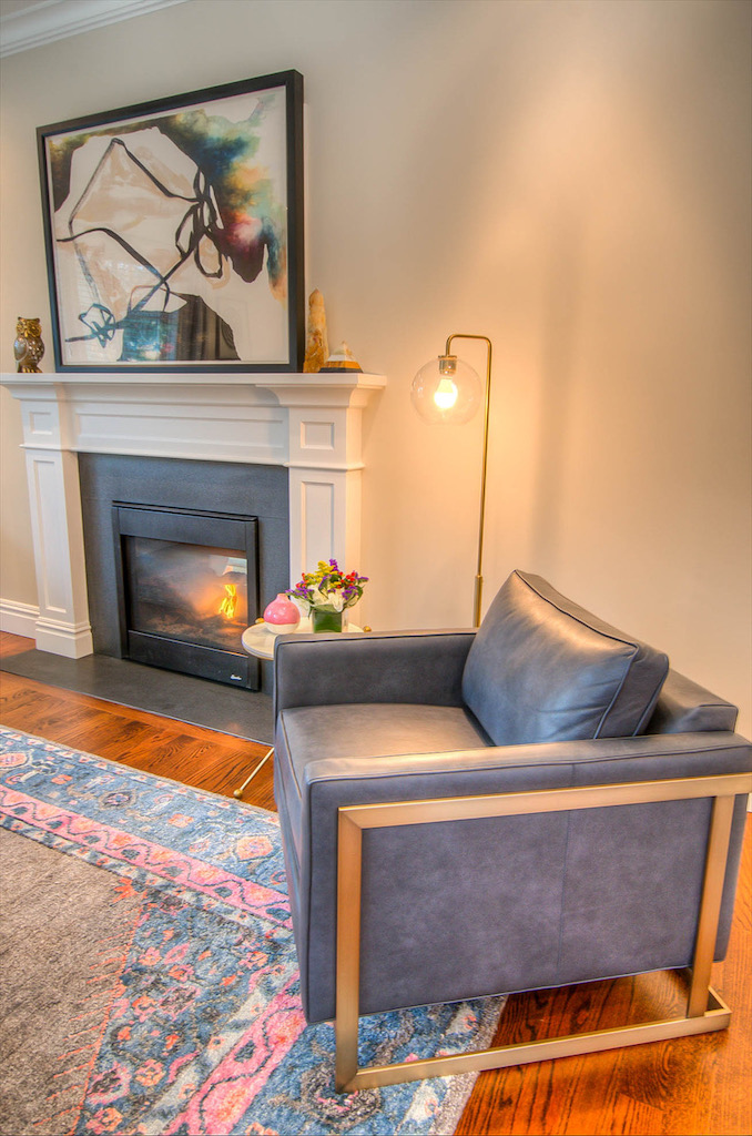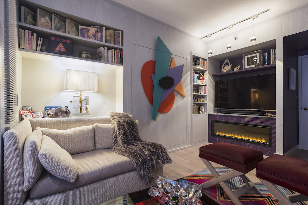 A fireplace doesn’t need to look old-fashioned to be warm and cozy. We designed this electric fireplace with a purple glass tile surround and a quartz top that sits below a television in a den/guest room in a downtown Boston condominium. The glass tile adds a bit of sparkle and color, and the fireplace adds literal warmth as well as visual warmth. The wall sculpture to the left is actually the handle to pull down the murphy bed when the room serves as a guest room. The comfy sofa and soft fuzzy throw add to the cozy vibe. It’s one of the smallest rooms in the condo, yet it’s a favorite for the owners and their guests. Even modern high-rise living spaces deserve a little old-fashioned warmth.