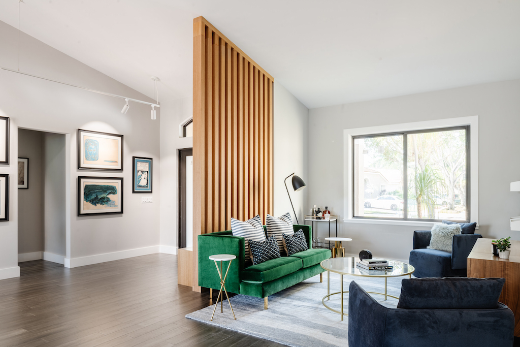 The Duoma Atelier team created a floor-to-ceiling slatted wood wall at the entrance which serves as an open “mud room” on the foyer side, dividing it from the new living room. As soon as guests enter the space, they can appreciate their hosts’ art collection on the gallery wall, which was designed with track-lighting and custom placards.