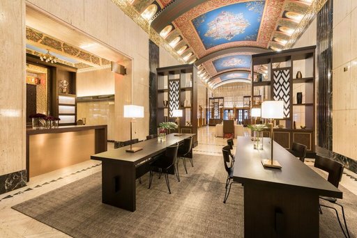 Standing at 777 feet tall, Madison Square Park Tower is the tallest residential building between Midtown and Lower Manhattan. The building’s interiors and five full floors of lavish amenities were designed by the preeminent London-based hospitality designer, Martin Brudnizki. Inside the lobby, an enormous glass bowl chandelier with bronze detailing hangs above the lobby desk, which was custom designed by Martin and created by luxury Czech lighting company Preciosa Lighting.