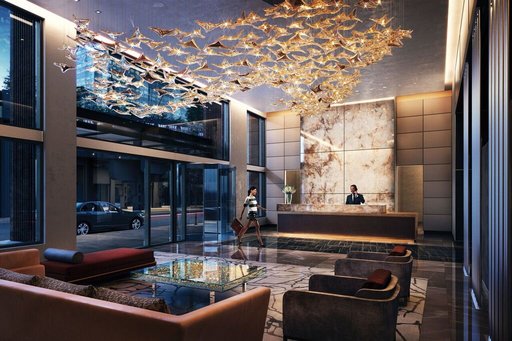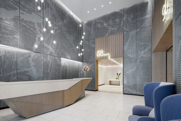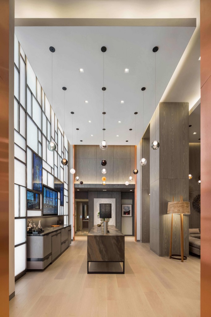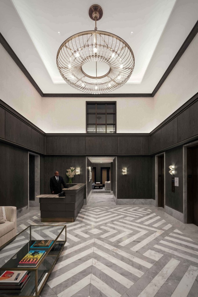 88&90 Lexington beautiful highlights old and new by seamlessly blending a classic pre-war building with a contemporary post-war building in the heart of NoMad. The buildings are united at their base by a bright, expansive lobby that features a multi-light pendant fixture that hangs above the desk and illuminates the building’s entrance. A neon “88” and “90” mark the entrance to each building, emphasizing the location of their separate elevator banks.