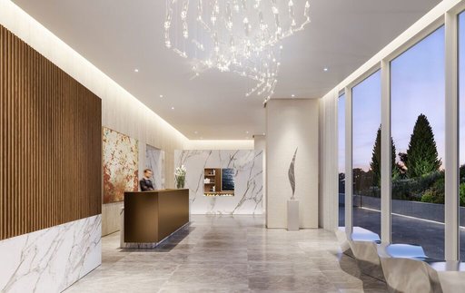 Designed by Richard Meier & Partners Architects and appointed by Champalimaud Design, the gracious lobby of One Waterline Square is a glass-walled, light-filled entrance overlooking the five-acre Waterline Square site. The stately space, located just inside a graceful porte-cochere, creates a sophisticated entrance and sense of arrival for the building’s residents. Designed by an Amsterdam-based art collective, the lobby’s bespoke ceiling light installation known as “Flylight” is made of delicate glass tubes and fashioned to interact with its surroundings, reflecting light from the marble and metal details inside the lobby and the Hudson River beyond it.