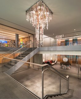 At 100 East 53rd Street, art collector Aby Rosen’s new modernist midtown tower, designer William T. Georgis commissioned Seguso from Venice Italy (a company that’s been around since the 1300s) to create a dramatic crystal Murano chandelier with beautiful, coral-like tubes. It is the focal point of the private residents’ club.