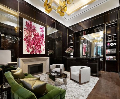 At The Kent, an art deco-inspired luxury condominium on the Upper East Side, Champalimaud Design commissioned a $33,000 pair of gilded chandeliers from Czech glass manufacturer, Preciosa. Designed to emphasize the Drawing Room’s cove, gold leaf ceiling, the sculptural work of art is composed of a series of luminescent glass orbs that refract light from within and reflect light from above.