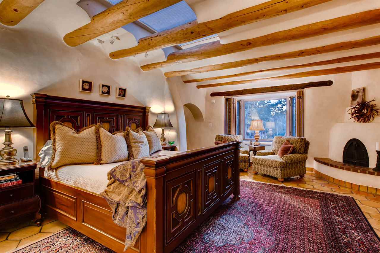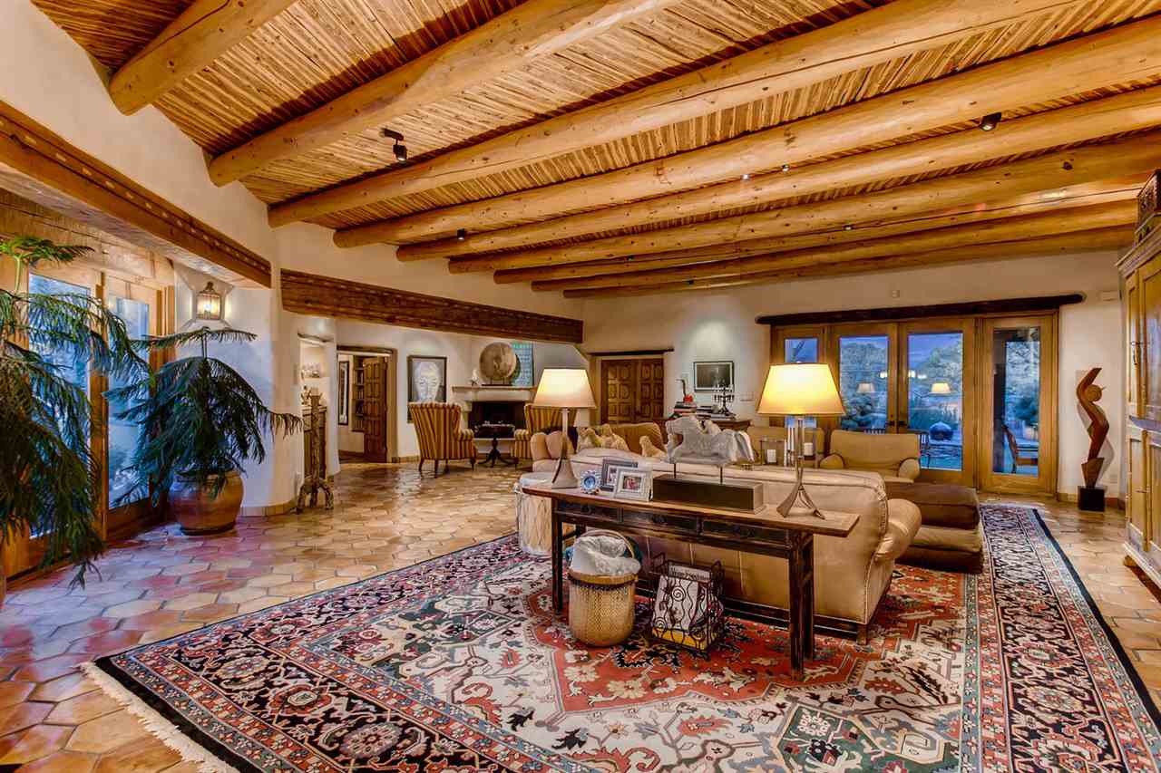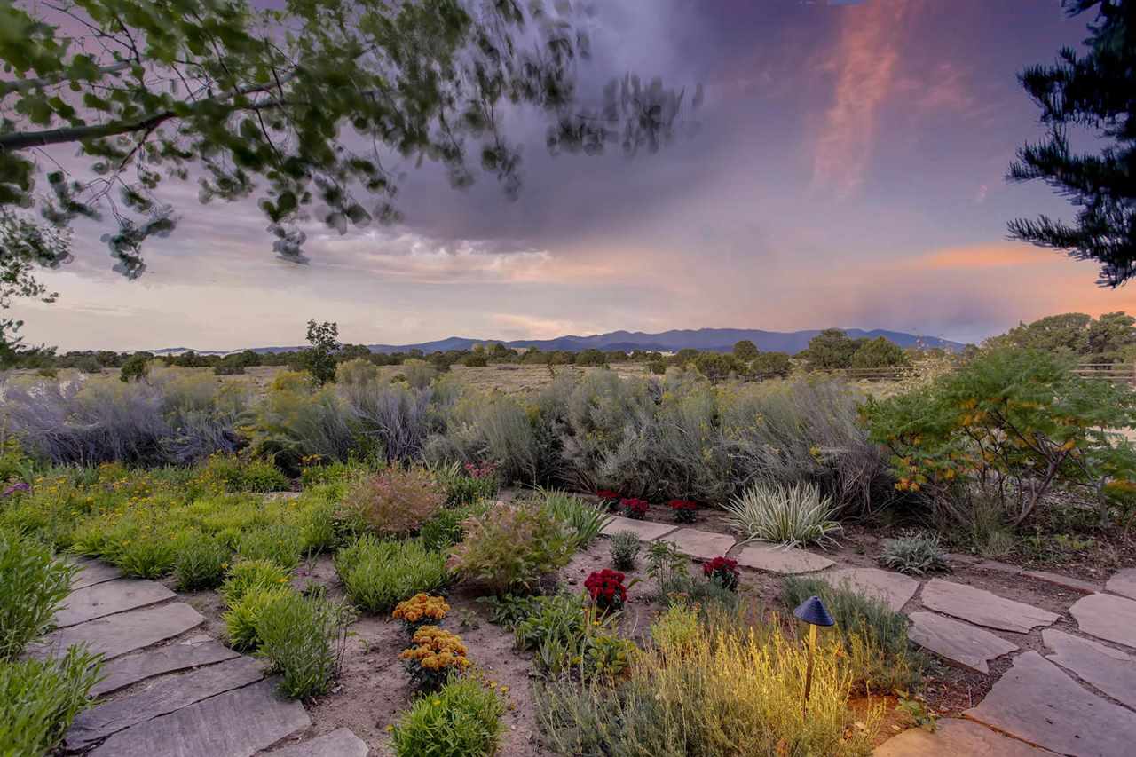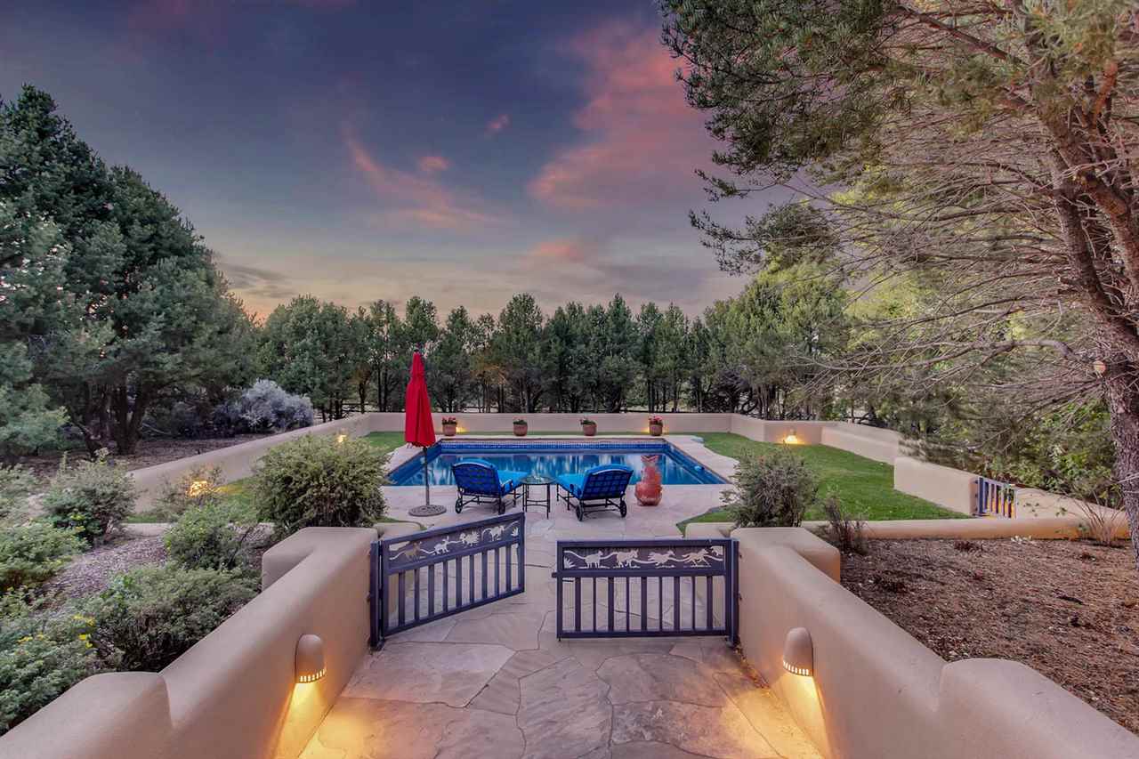 10 minutes from Santa Fe’s Plaza, this private, view-filled 15 Acre horse property and elegant double-adobe estate is the ultimate Santa Fe treasure. With beautiful Sangre de Cristo views, this single level, impeccably maintained 5500 sq. ft. Buzz Bainbridge 4 bedroom/4.5 bath home has authentic Southwest elegance and is a fabulous home for entertaining with a large open floor plan and an effortless flow into the lush, view-filled, extensively lighted outdoor areas. The main house: double adobe construction, vigas, in-floor high efficiency radiant heat, 2 master bedroom suites (4 bedrooms in main house), a large bonus/flex room, 7 indoor and 1 outdoor fireplaces, 3 large portals, a heated outdoor swimming pool, extensive hardscaping, perennial flower and vegetable gardens and lush landscaping. The guest house: 1 bed/1 bath, 1000 sq. ft., a full kitchen, fireplace and 2-car garage. The Horse Facilities: a barn with 4 inside/outside stalls, riding ring and 15 acres of fenced pasture with livestock watering facilities. The barn is currently used as a working art studio and has a 432 sq. ft. heated office space. An outstanding property. The 15-Acres is comprised of 3 individually parceled, flat lots with 1 private well and 1 shared well.