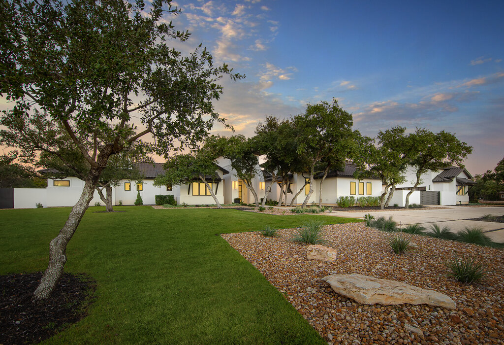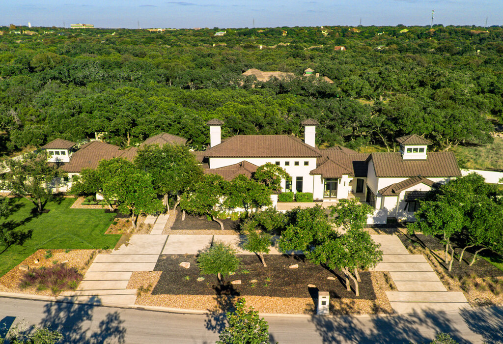 Designed by Gustavo Arredondo and executed by premier builder, Paul Allen Custom Homes, this stunning contemporary-style estate exemplifies the quality and refined sophistication associated with Huntington at Shavano Park. Situated on over an acre lot in a 24-hour guarded and gated community, the property features an unparalleled resort-style back yard with a sparkling Keith Zars pool, spa, built-in trampoline, fire pit, large covered patio, outdoor kitchen, and garden. The open-concept interior spaces feature high ceilings, custom architectural features, designer-selected finishes, and appointments. After spending a day enjoying the outdoor entertainment spaces, relax around the fireplace in the spacious family room. Adjacent to the wine closet and wet bar, the formal dining room with the uniquely modern drum chandelier is perfect for entertaining guests. A top-of-the-line Thermador professional appliance package, quartz counters, marble backsplash, custom cabinetry, massive waterfall island, and espresso machine outfit the epicurean kitchen. Spend your evenings melting away stress in the luxurious primary retreat, which contains patio access, a sizable walk-in closet with vanity area, a spa-like en suite bath with a coffered ceiling, double vanity, freestanding soaking tub, dual commode closets, and a glass rain shower. For ultimate entertainment and year-round enjoyment, the home also includes an indoor basketball/recreation room.