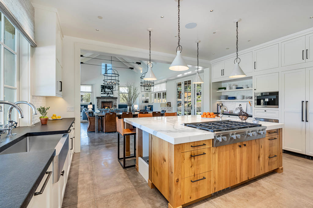 The residential compound showcases a newly built modern barn-style residence and party barn, created by the notable team of Wade Design Architects and Jennifer Robin Interiors, and inspired by Napa Valley’s rustic rural architecture. Centered on a dramatic great room with lofty ceilings, pocketing doors, and radiant heated concrete floors, the home blends exquisite design elements and high-quality finishes, including custom built-ins, shiplap detail, Water Works plumbing fixtures, and meticulously curated lighting. Within its smart, open floor plan, the residence also features a spacious first-floor master suite with a luxurious well-appointed bath, a handsome office with a wall of white oak display shelving, a powder room, an inviting second-floor guest suite, and an adjoining loft/media room with the opportunity and size for conversion to a third bedroom suite.