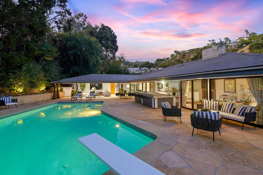 An adjacent butler’s pantry provides additional prep space and leads to the guest/live-in quarters. On the opposite wing of the home, there is a large office with built-ins and a media center. The primary suite accesses the gardens through a sliding glass door and includes dual closets and a spa-inspired bathroom with a separate shower, tub, and dual-sink vanity. Outside, a newly finished outdoor living room is the perfect place to entertain and relax on warm summer nights. The nearby separate guest house features a living area plus a bathroom and looks out to the home’s central atrium. The backyard also has an oversize outdoor kitchen/barbecue, pool, built-in lounge seating, grassy lawns, mature orange trees, and vistas of the sprawling city beyond. Welcome to this coveted location perched above the famed Sunset Strip, just moments from the heart of Beverly Hills and the very best shopping, dining, and entertainment the area offers.