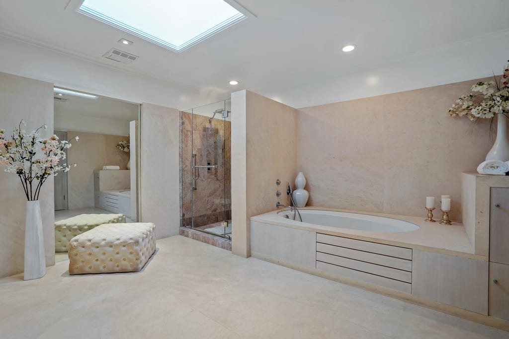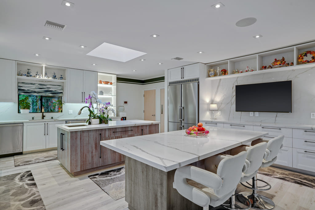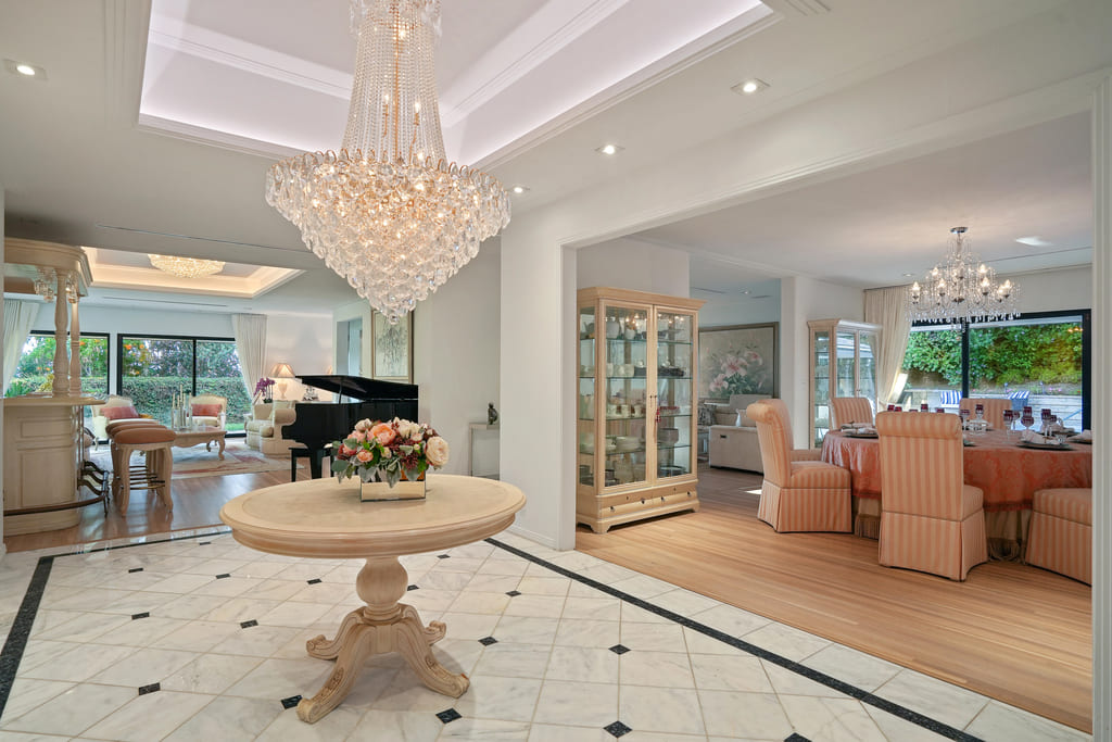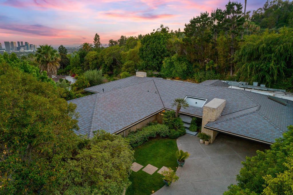 This quintessential Trousdale Mid-Century architectural offers the echo of original style and glamour upgraded for today’s more modernized lifestyle. Verdant grounds surround this estate imparting beautiful green garden views from literally every room. City lights twinkle on the night horizon while privacy is fully afforded at every turn. Through a motorized gate, discover a tranquil sanctuary replete with well-manicured landscaping along the path to the front door. Inside, the foyer greets guests upon arrival with its chandelier of stunning importance and tray ceiling illuminated by recessed lighting. The spacious formal living room features a wet bar with pull-up seating and walls of glass framing lush greenery. Wood floors flow through the wraparound floor plan to reveal multiple sitting areas and a family room with a fireplace. The formal dining room is positioned near the newly upgraded chef’s kitchen which features two islands, a skylight, built-ins, and top-of-the-line stainless-steel appliances including a Viking cooktop with hood.