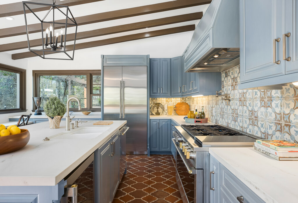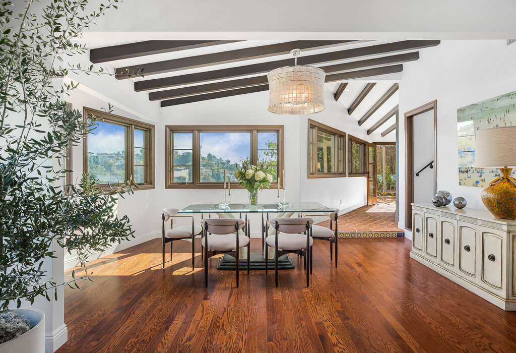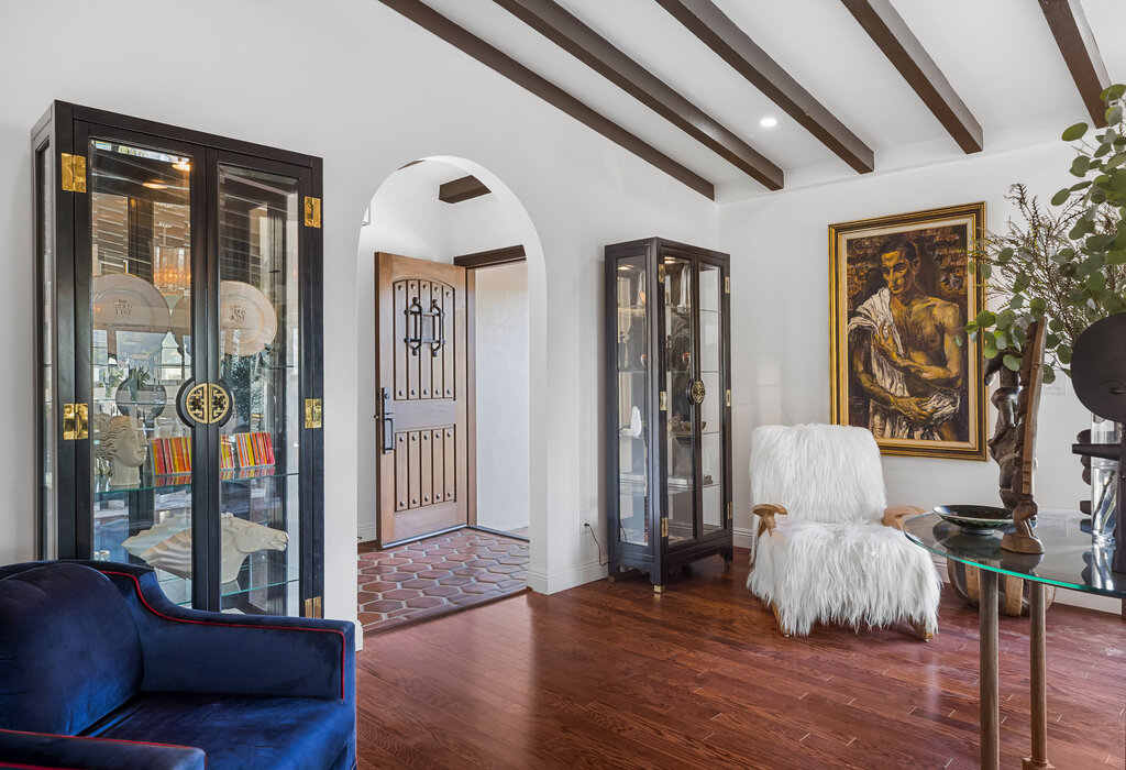 Located in Outpost Estates, this residential spread is nestled near Runyon Canyon Park. Only a 4-minute drive from Hollywood Boulevard, Graumann’s Chinese Theater, and Dolby Center, or 3 minutes from Mulholland Drive above. This surrounding is very serene – a perfect abode for those who work from home. The property sits on a half-acre, up a long driveway above the street. Four cars are easily parked at top of the drive and in the garage, which has an Electric Vehicle charger in the garage. The house is adorned with traditional wrought iron, Talavera, and Saltillo tiles plus richly toned hardwood floors. As much a traditional Spanish, it also has a modern sensibility. The ceilings are 9′ or higher in most areas with sloping wood beams. Through a speak-easy front door, the entrance has a large coat closet and access to the garage. You enter through an arch into the extensive living room, complete with wood beams, recessed lights, and a large working lava-stone fireplace. Two French doors open to the front patio with a large hot tub for six and an area for sunning or outdoor dining. Stylish Fuse Lighting fixtures adorn the entrance, living room, and dining room. Original sconces have been refurbished with alabaster-style glass. The connecting dining room has huge windows with wonderful sweeping canyon views. Adjacent is a beautiful chef’s kitchen with custom cabinets and Saltillo tile floors. Top-of-line Monogram appliances include a 48″ gas/electric/convection oven range, with a powerful hood and a pot filler faucet. 23′ linear feet of countertops include a built-in desk.