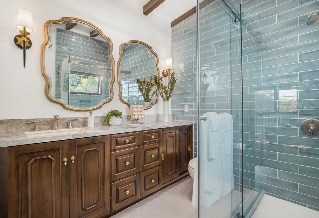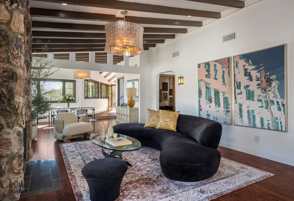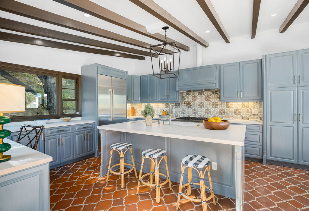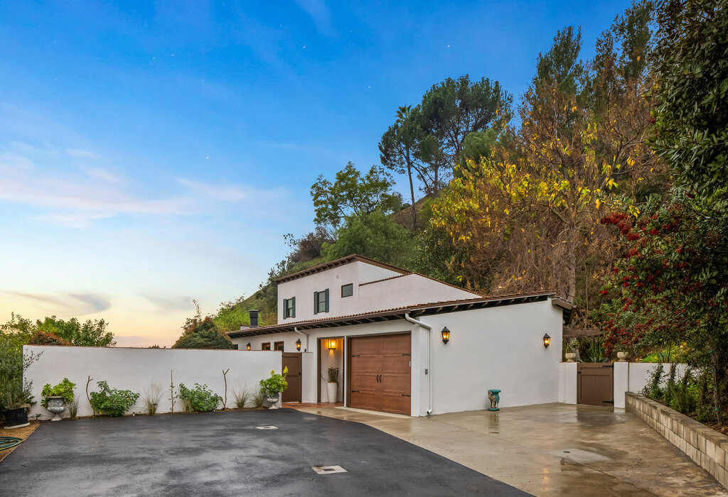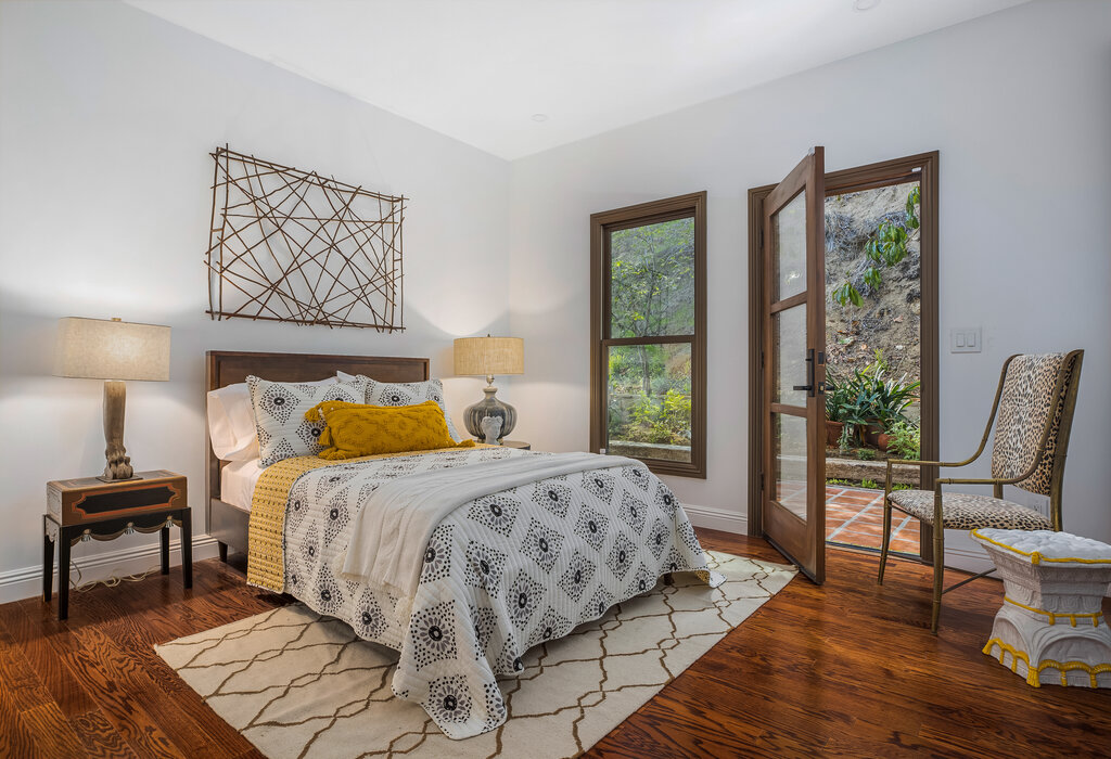 The kitchen is the soul of the home. A large island has seating for four. A Monogram dishwasher and beverage refrigerator sit under Cosentino Dekton stone countertops. Nearby is a large pantry. French doors open to an outdoor dining pergola, with Key West lighting, canyon views & lush vegetation. There are 4 bedrooms and 3 baths. The primary bedroom occupies the 2nd floor, with a large walk-in closet and bathroom featuring gorgeous Neptune tile, glass shower doors, and custom cabinetry. The suite feels like a treehouse, with a large magnolia tree flowering on one side, and canyon views on the other. The second bedroom is warm & light-filled. It can also be used as a television/media room or the perfect nursery, with a large closet. The third bedroom is spacious with a door to the outside and a large closet. The fourth bedroom could also serve as a home office or nanny’s room, with a private entrance and ensuite bathroom. The house has a Spanish Colonial feel. Beautiful new interior design by acclaimed Woodson & Rummerfield’s House of Design. It also has provenance and was home to a War Hero, a French Legion of Honor recipient, and a noted dance instructor, who taught many Hollywood stars how to dance. A fitting history for a residence that exudes such warmth and charm.