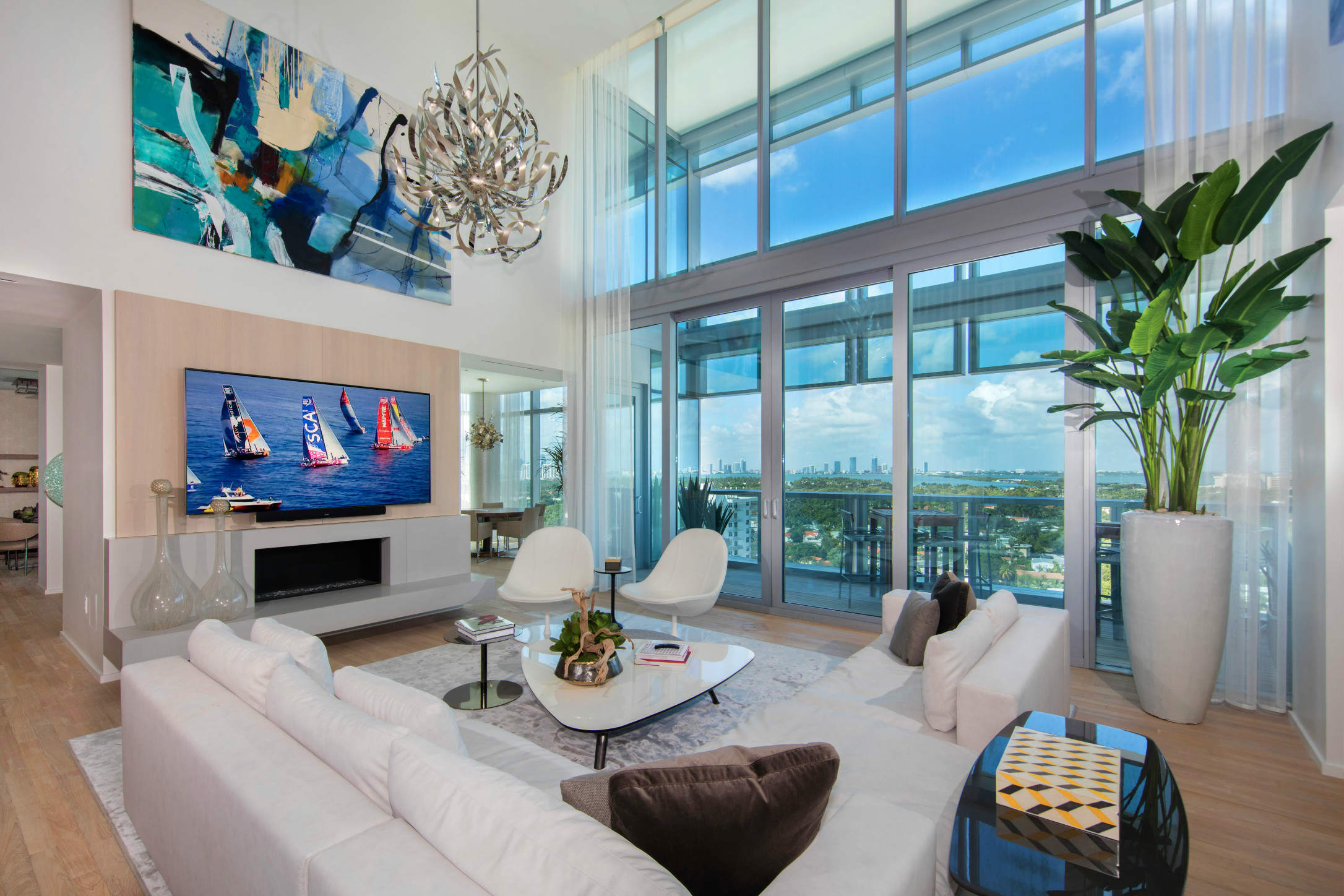 The first floor, welcoming with an open layout, features a spacious living room, impressive 20-foot floor-to-ceiling windows, a separate private dining area, a family/media room, a guest room with a full bathroom, and a gourmet kitchen by Bulthaup with top-of-the-line appliances. The sprawling terrace with open seating offers spectacular views of Biscayne Bay, Miami Beach, and downtown Miami.