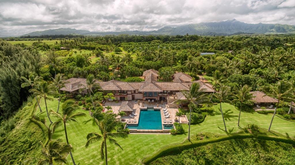 The estate consists of a main house and two guest pavilions totaling 4 bedrooms, 6.5 baths and a 2-bed, 2-bath nearby caretaker’s residence resting on 15+ acres that includes an active farm with exotic palms, citrus and coconut trees. Secluded and private however, the quaint town of Kilauea, with restaurants, coffee shop and bakery is a 5-minute bike ride away. World class golf at Princeville and the town of Hanalei are close.