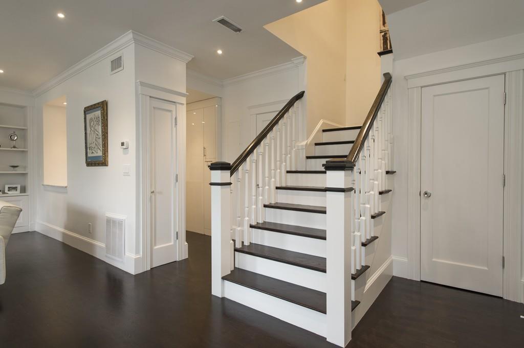 An elegant wide staircase leads to two bedrooms, two bathrooms, and a laundry.