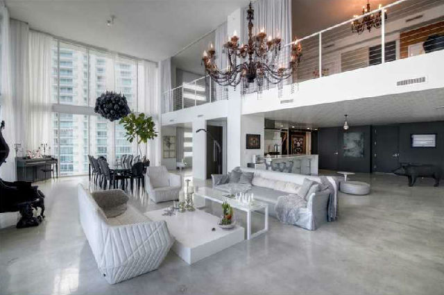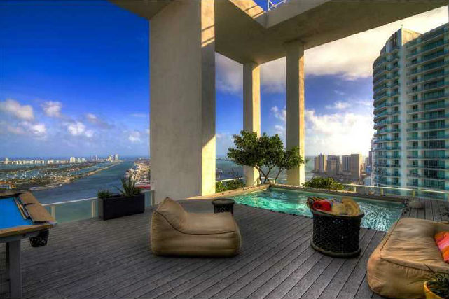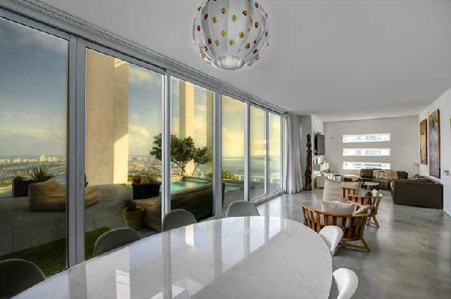 Panoramic views of the Miami skyline, Biscayne Bay, South Beach, and the Atlantic Ocean can be seen from the residence with five bedrooms, five-and-a-half bathrooms.
