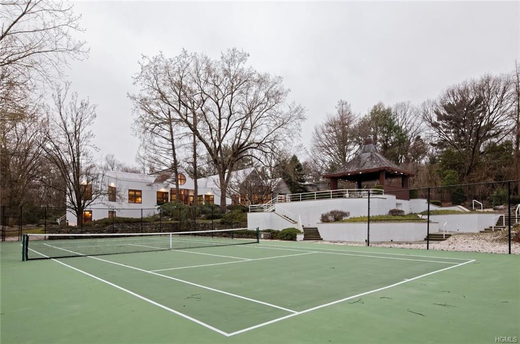 Fabulous light filled estate sprawling out on 2.2 acres comprised of a full tennis court, vast gardens wrapped around a beautiful outdoor pavilion and pool. Private gates open to a captivating Courtyard surrounding this contemporary 6 bedroom, 9.5 bath stately home. This one of a kind home features unique architectural details at every angle. Entry leads to a double door gallery foyer featuring pristine granite tile floors. Soaring ceilings feature skylights running the full length of the home. The LR w/fpl leads to a Sun Room, Study and add’l LR. DR seats 12 and offers a granite-topped serving buffet and dry bar. EIK features soaring glass ceilings and flows into Family Room. Bkft Rm leads to the tiered patio with BI BBQ. MBR, MBth w/ h/h commodes, sep. shower w/Jacuzzi tub, 3 walk-in closets, sitting room, and patio. 5 add’l BR’s all w/Bath. LL offers 2 workout rooms, FR w/Fpl, billiard and room, expansive bar with seating for 10. 2 add’l baths.