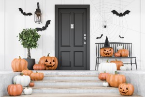 Carved,Pumpkins,,Bats,And,Spiders,On,Stairs,And,Bench,Near