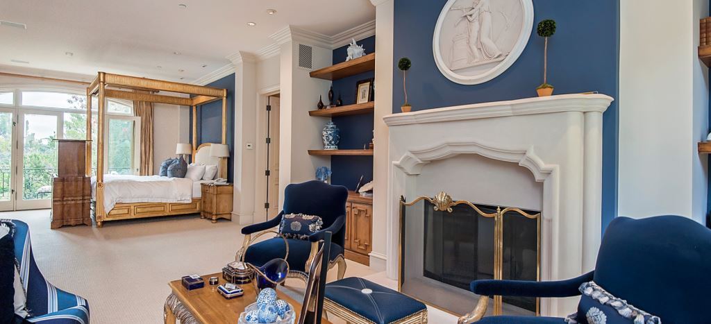 A grand master suite boasts dual marble bathrooms, walk-in closets, a fireplace and sitting area.