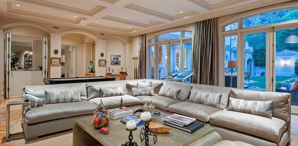 Masterfully designed for entertaining, a two-story entrance hall leads to magnificent public rooms, including a double formal living room, opulent dining room, screening room, parlor, and wood-paneled library. French doors open to expansive terraces and loggias.