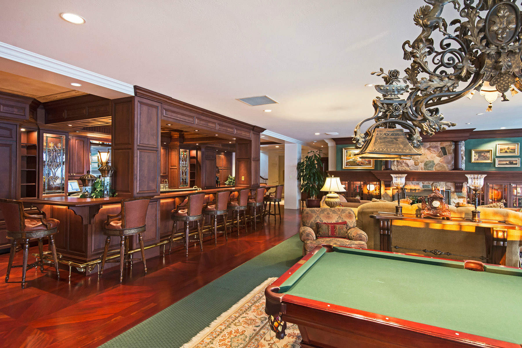 There is a open floor plan, high-end finishes, custom doors, a custom hand carved fireplace, and so much more. This four-bedroom, nine-bathroom, 14,879-square-foot home features spacious rooms, soaring ceilings, and beautiful windows that look out to the large private yard with a dazzling pool and lavish grounds, a year-round waterfall and stream feature, and outdoor play area. Custom built with Spanish granite imported just for this home, a six-car garage with a heated driveway and sidewalks, and charming, playful statues to welcome you, it is certainly one-of-a-kind.