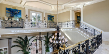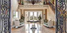 As you pass through the wrought iron gates and up the winding driveway, you are greeted by a large motor court which has access to the 5+ car garage. Inside there is approximately 21,000 square feet of luxurious living space with 6 bedroom suites and 11 bathrooms. Beyond the wrought iron front doors is a 2-story foyer with grand staircase and chandelier.