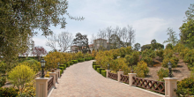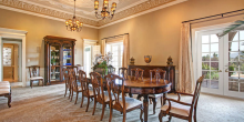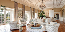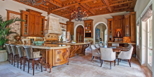 Other rooms include a large formal living room with fireplace and French doors leading to a balcony, formal dining room with French doors leading to a patio, home office, Edwardian Library with private libation bar, gourmet kitchen with intricate coffered ceiling and butler’s pantry, breakfast room with barrel box beam ceiling and doors leading to a veranda, family room with fireplace, 1400 square foot private terrace off master suite, home theater and a 5,000 bottle wine cellar.
