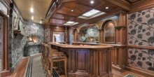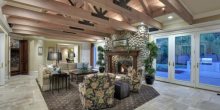 The single-family home with a formal entry; “intricately-designed” ceilings; and hardwood, marble, and tile flooring throughout also has seven fireplaces, an eat-in kitchen with a built-in barbecue grill and pizza oven, a wine cellar, a library, an indoor fitness pool, a game room with a bar, a formal dining room, a living room, a separate family room, and a home office. Bathrooms come with granite and marble accents.