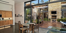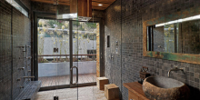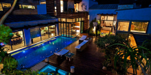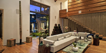 The estate features incredible design details, including 500 year-old reclaimed teak floors, hand carved stone, glass walkways and water features throughout.