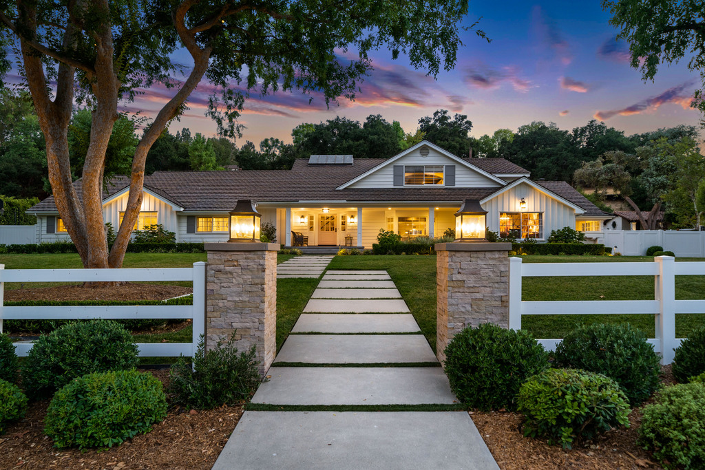 Quintessential Hidden Hills Traditional. Sited on a premier 1+ acre lot on one of HH’s most sought-after streets, this timeless family compound radiates happiness, light, and tranquility. From the moment you arrive, you’re greeted by a charming front porch and welcoming foyer. Spacious interior flow includes a gracious formal dining room, an entertainer’s living room with a sunken bar, and a wood-paneled retreat/library anchored by a cozy fireplace with French windows and garden views. A true Chef’s Delight Country Kitchen complete with Viking Professional Appliances, Calcutta Gold marble countertops, butler’s pantry, center island with prep sink, and breakfast room with brick fireplace and walls of French windows.