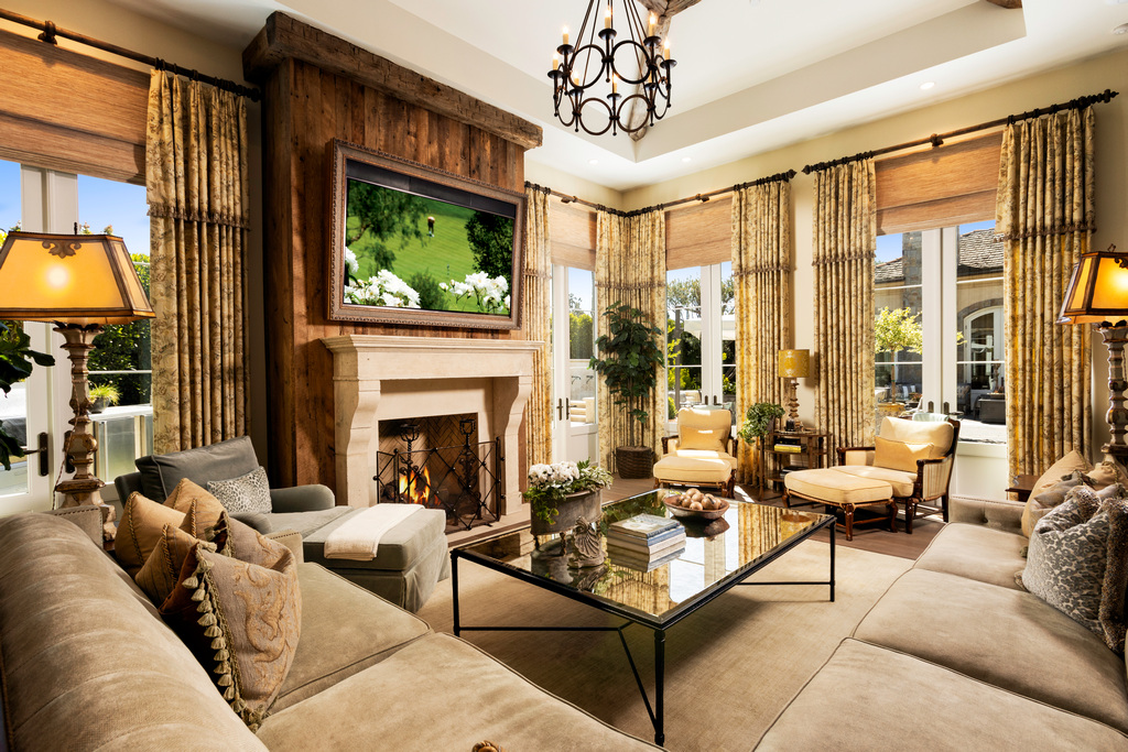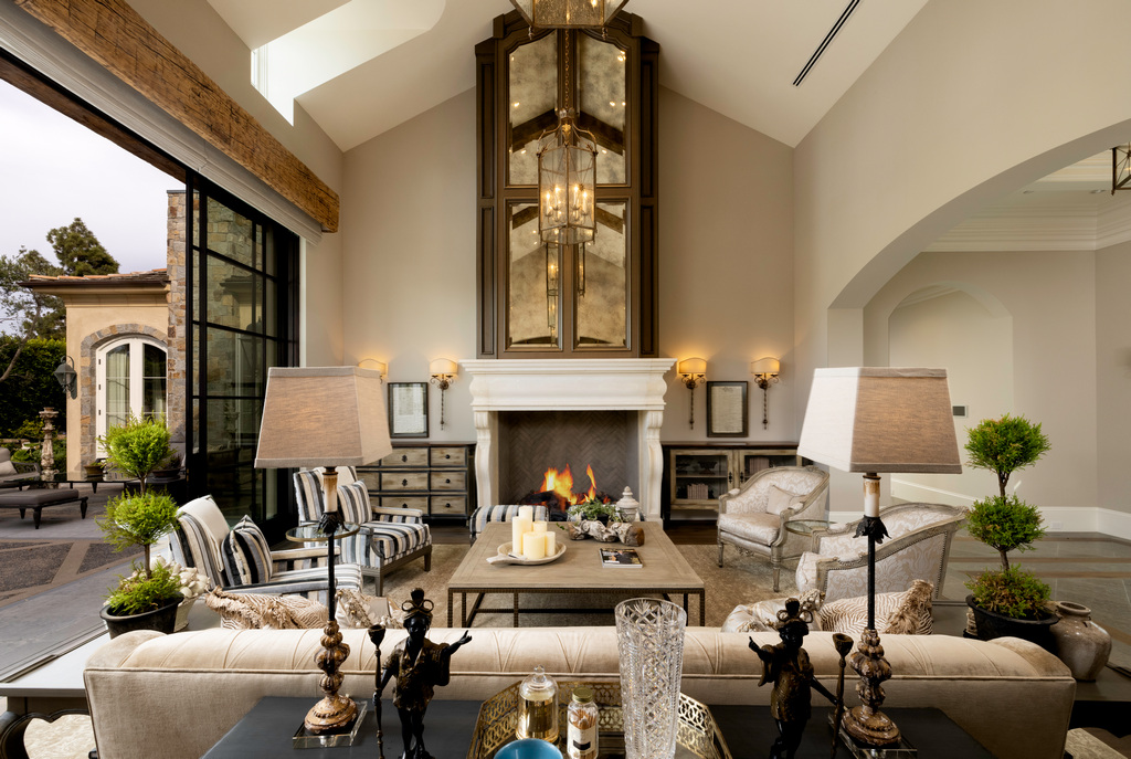 Located in the heart of Big Canyon, this exceptional French-inspired estate sits on a large corner lot and is the epitome of spacious indoor-outdoor living. The stunning custom gated entry leads you into the beautiful entryway where you are greeted with beveled glass on the tall wrought iron doors and a custom chandelier, which opens up to the expansive living room. With vaulted ceilings and reclaimed oak beams, the living room showcases custom chandeliers, sconces, and wrought iron pocket doors to the inviting rear yard and an alluring antique French limestone fireplace with custom woodwork and Venetian mirror. Next to the living room is the formal dining area complete with a custom built-in bar and china cabinet, clear ice maker, and mini-refrigerator, which opens up to the spacious kitchen with top-of-the-line appliances including a Wolf microwave, side-by-side Subzero refrigerators, Miele dishwashers, and two warming drawers. The chef’s kitchen features custom cabinetry, a custom-built hood with plaster and reclaimed oak beam, Calcutta Oro marble countertops, a large island, and a pantry with custom iron details and reclaimed wood.