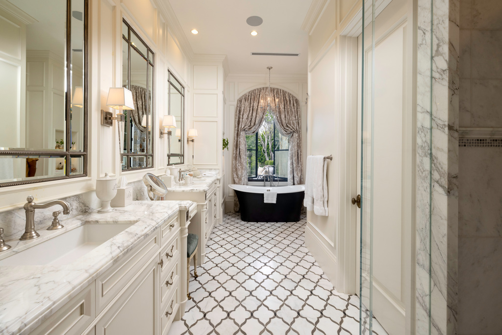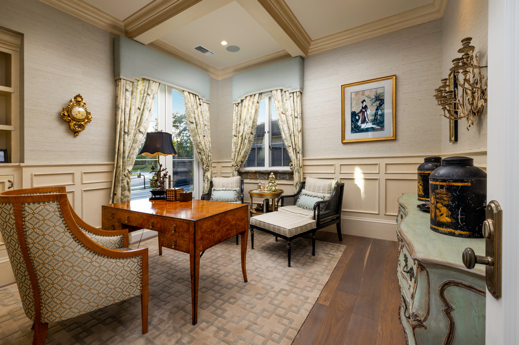 Leading to the family room with antique French limestone fireplace, custom chandelier, and reclaimed oak inlaid ceiling and beams. Within this European estate, the main floor master suite greets you with reclaimed oak beams and French doors to the rear yard, an antique French marble fireplace, a custom armoire with a Venetian mirror, and his-and-hers custom closets. The spa-like bath features Calcutta Oro marble countertops, Swarovski crystal faucets, a soaking tub, and a chandelier. This master suite allows for immediate reach to the backyard through french doors. The home also enlists three beautiful guest suites with custom closets, his-and-hers offices, laundry room, and upstairs bonus room. The pleasant ambiance continues into the rear yard which is perfect for entertaining, with a jacuzzi, water feature, and a built-in Lynx barbeque, sink, and mini-refrigerator. Welcome to your very own French getaway.