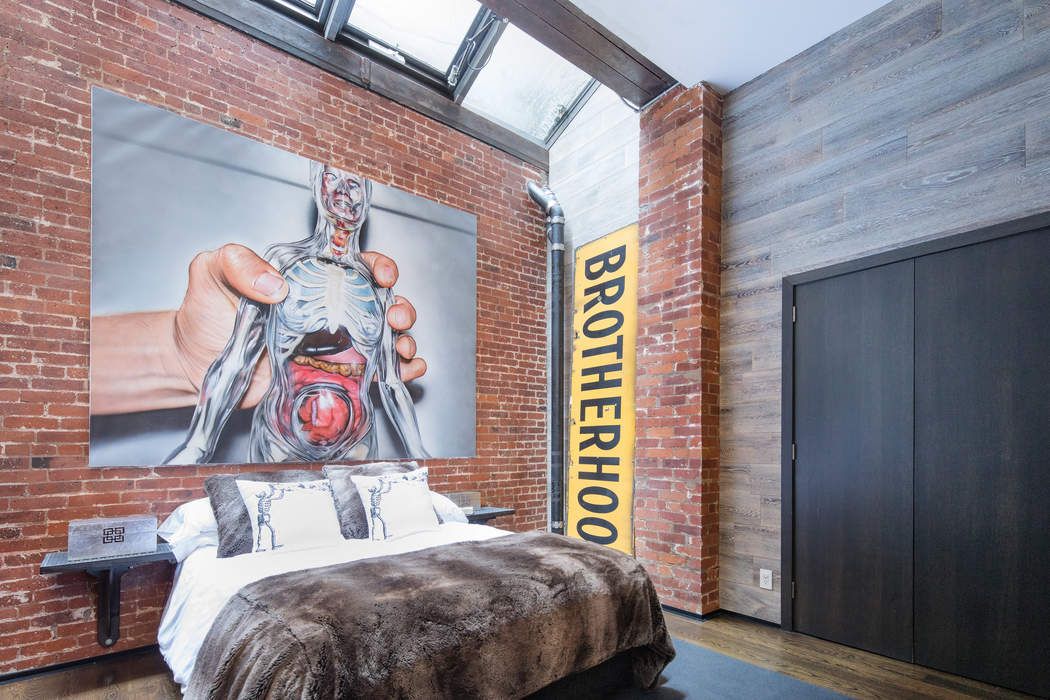 The expansive master suite is a homage to the grandstand suite of old. The space measures 23ft+/- in length and is commemorated by a large wall of blackened steel that offsets the adjacent red brick wall. Sky lights and radiant heated floors with 200-year-old reclaimed Tibetan stones add to the sense of artistically-hip luxuriousness and sought-after privacy.