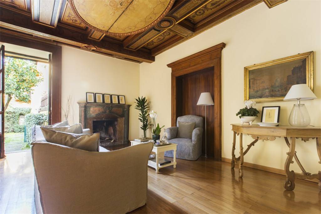 Exquisite artisanal touches are expressed throughout the home: bespoke antique finishes, circular carved-out ceilings with Venetian flair; monumental staircases; stately reception rooms, a marble stone fireplace; world-class architectural millwork with doors, baseboards and window casings carved out of the finest, classic woods. The home has a number of large and stunning terraces, including a rooftop terrace that provides an unobstructed, panoramic view of Rome. The floors are made out of nailed oak parquet designed in a herringbone pattern.