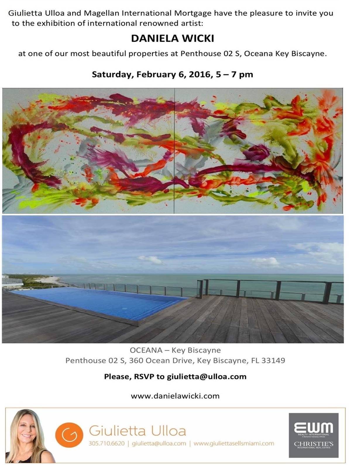 Giulietta Ulloa and Magellan International Mortgage have the great pleasure of inviting you to the exhibition of internationally-renowned artist, Daneila Wicki, at one of our most beautiful properties at Penthouse 02 S, Oceana Key Biscayne.