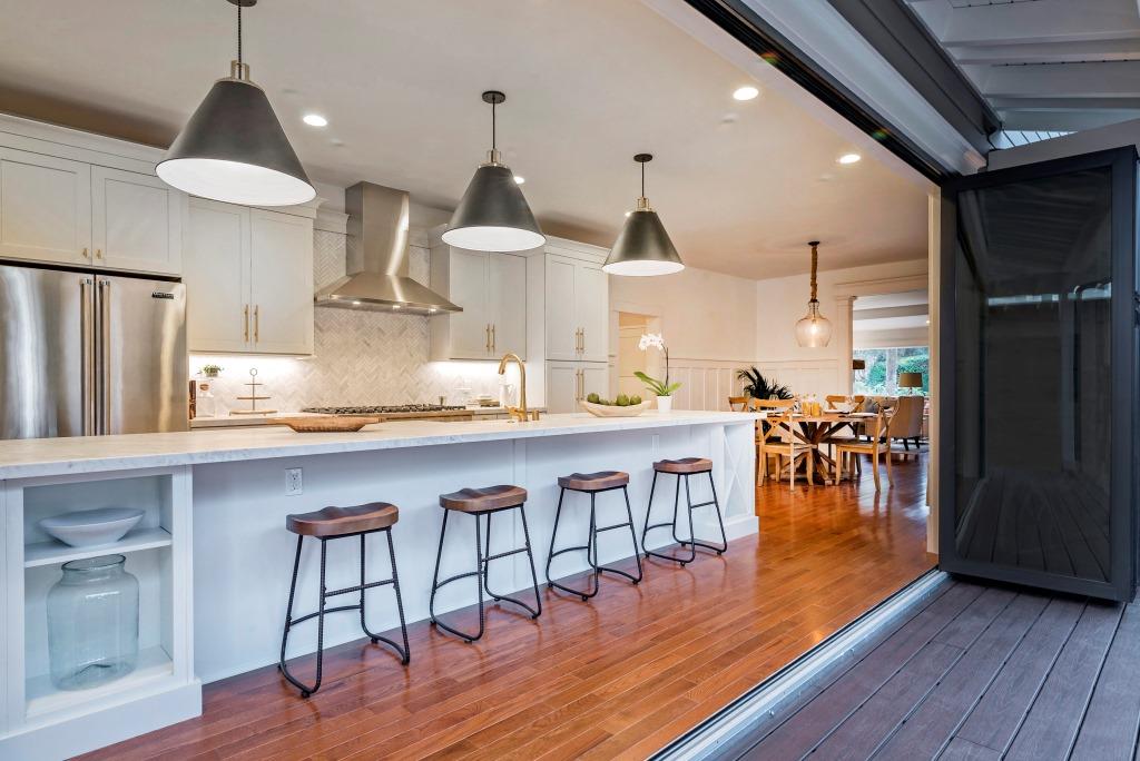 The gourmet kitchen that is an absolute entertainer’s delight with an oversized island with state of the art panoramic doors that open up to the exterior deck, eliminating the divide between the interior and exterior of the home.
