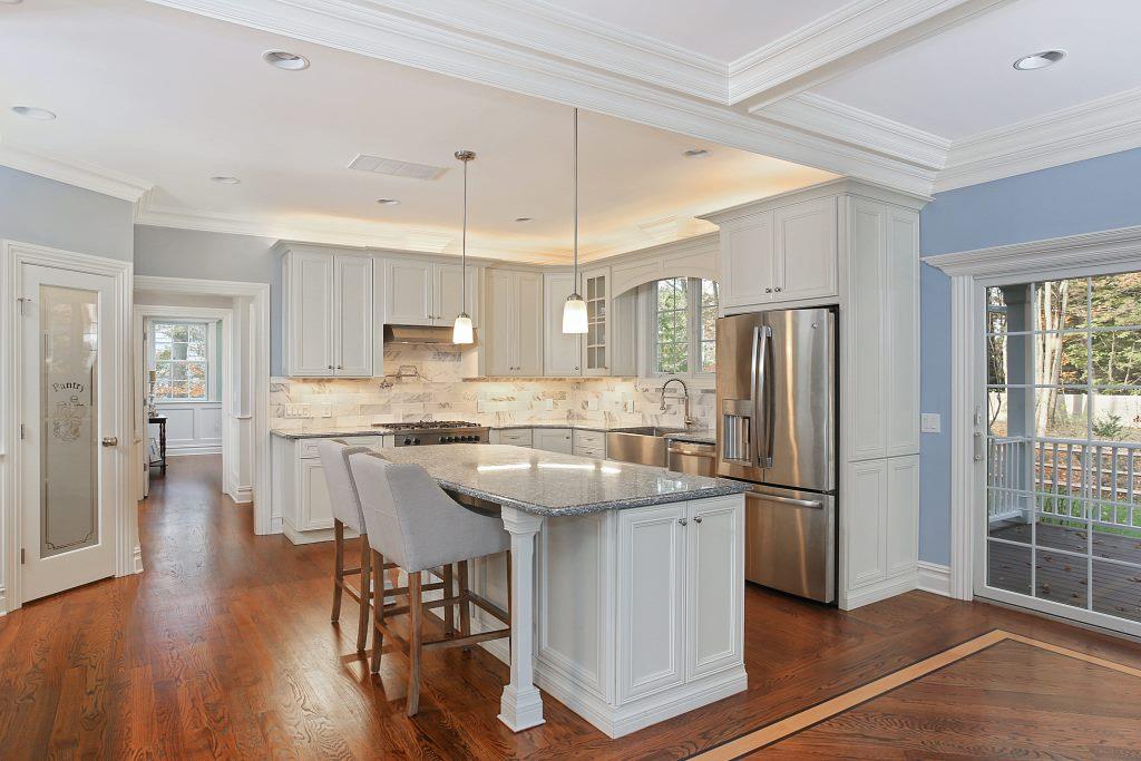 First floor enjoys a beautiful formal living room and large dining room. Relax in the spacious family room with gorgeous coffered ceiling, gas fireplace, wet bar with wine refrigerator and access to covered rear deck. The gourmet center-island, eat-in kitchen boasts granite countertops, stainless steel appliances and pantry.